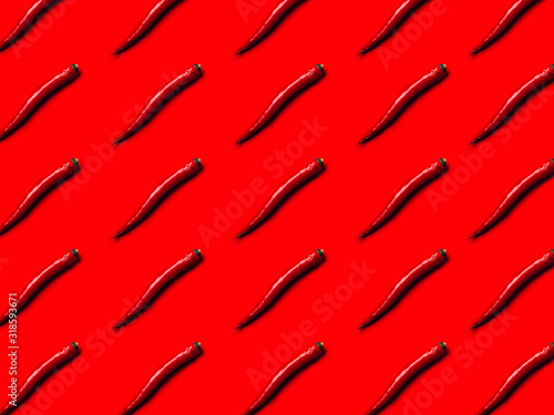 Pattern red chili on red background flat lay