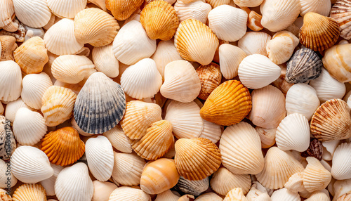 Pattern, texture of sea shells; flat lay; wallpaper