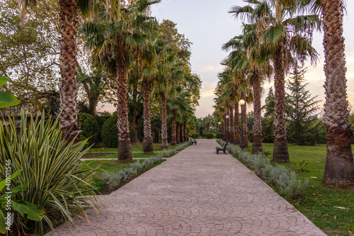 Paved path with benches and lanterns along palm trees. No people walking along the alley in the nature park.