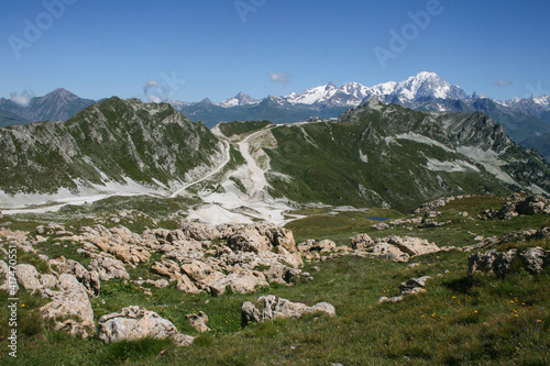 Paysage de haute montagne au dessus des Arcs dans les Alpes françaises avec une vue sur le Mont Blanc