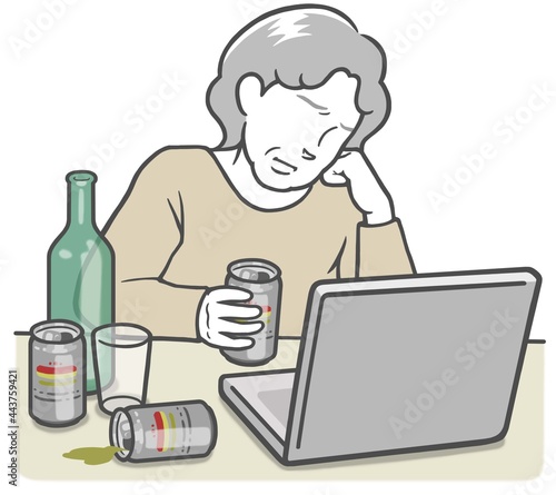 negative, drop, alcohol, personal computer, apprehension, middle-aged, woman, illustration, cartoon