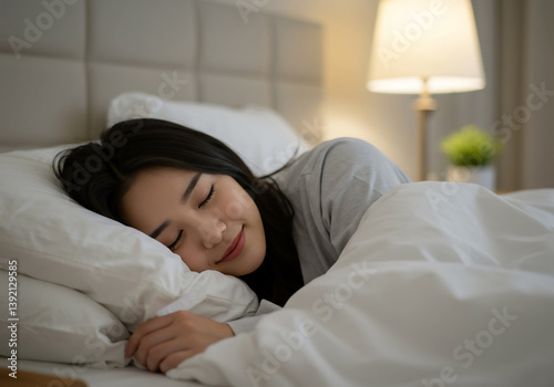 Peaceful Asian Woman Sleeping in Bed, Smiling, White Sheets, Cozy Bedroom, Lamp, Comfort.