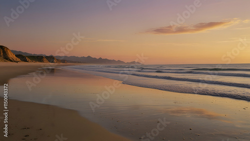 Peaceful Beach Sunrise with Soft Gentle Waves Creating a Tranquil Atmosphere of Natural Beauty