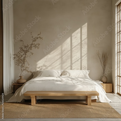 bedchamber, interior, design, light, window, bed, pillow, blanket, bench, rug, wood, furniture, vase, plant, wall, beige, minimalist, serene, calm, peaceful, sunlight, shadow, curtain, bedside, table, decor, home, style, rustic, neutral, tone, natural, simple, elegance, architecture, modern, contemporary, space, dwelling, residence, apartment, indoor, linen, textile, floor, illumination, tranquil, artistic