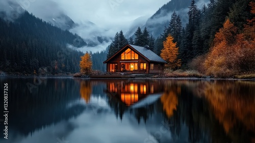 Peaceful Cabin by Serene Lake Surrounded by Autumn Foliage and Majestic Mountains at Dusk
