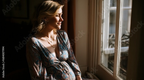 Peaceful Caucasian pregnant woman in patterned dress gazing through sunlit window at home, natural light highlighting her profile in intimate maternity portrait