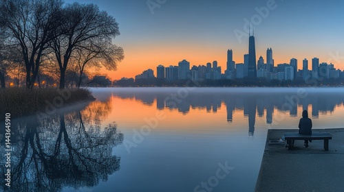 sunrise, city, lake, park, morning, peaceful, tranquil, serene, calm, fog, mist, tree, autumn, winter, cool, city landscape, skyline, chicago, nature, view, us, horizon, person, seated, bench, water, waterfront, urban, landscape, golden hour, photo, image, photo, beauty, stillness, silhouette, early morning, cold, still water, vibrant, ambience, calmness, quiet, city view, scenic