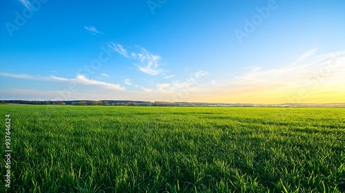 Peaceful Early Morning Landscape of Verdant Grassland Under Serene Blue Sky with Warm Sunlight