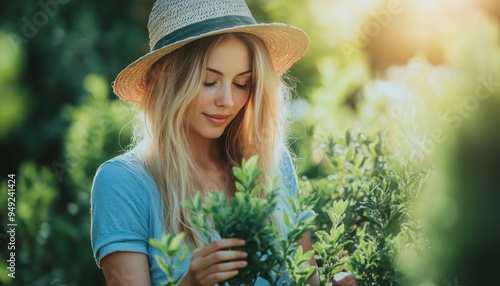Peaceful Garden Moment Woman in Soft Light, Pruning Plants with Calm and Serenity, A Tranquil Scene of Nature and Mindfulness