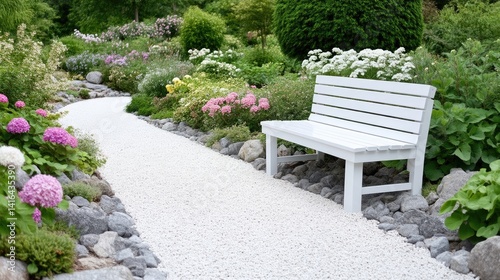 Peaceful garden path with white bench. A tranquil scene showcasing a winding gravel path amidst vibrant flowerbeds. A simple white wooden bench invites relaxation