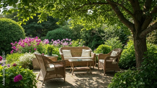 garden, patio, wicker, furniture, tree, flower, greenery, relaxation, peaceful, tranquil, sunlight, shade, cushion, seating, summer, backyard, lawn, blooming, plant