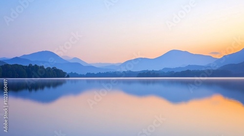 Peaceful lake reflecting the surrounding mountains during a beautiful sunrise. Ideal for outdoor adventure, travel, and nature themes.