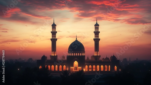 copy space, mosque, dawn, eid, prayer, illumination, sunrise, peaceful, gathering, twilight, architecture, spirituality, community, worship, tradition, celebration, serene, landscape, design, faith, culture, event, beauty, harmony, atmosphere, morning, sacred, space, calmness, oneness, religious, heritage, skyline, cloud, dome, minaret, serenity, ambience, ritual, prayer, time, place, devotion, impression, light, generative