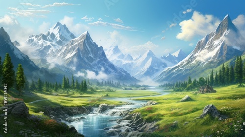 mountain, vale, landscape, river, stream, waterfall, green, grass, meadow, field, forest, tree, cloud, sky, blue, nature, wilderness, scenic, beautiful, tranquil, serenity, peaceful, idylli, picturesque, majestic, snow-capped, summer, sunshine, day, travel, vacation, adventure, exploration, hiking, camping, photo, postcard, wallpaper, artwork, digital artwork, illustration, fantasy, magical