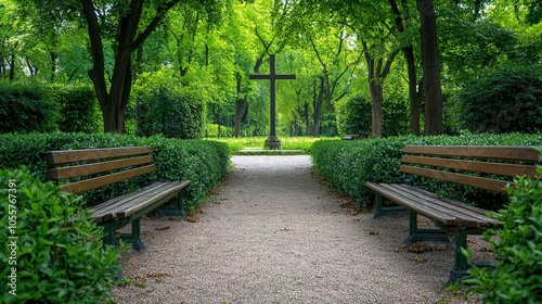 park, cross, peaceful, nature, green, tree, bench, pathway, serene, garden, calmness, calm, leisure, landscape, setting, relaxation, summer, foliage, sunlight, scenic, view, fresh air, recreation, solitude, harmony, environment, grass, space, wood, sculpture, religious, stillness, beauty, inviting, quiet, retreat, exploration, culture, community, path, symmetry, balance, paseo, flora, travel