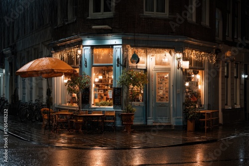 peaceful rainy street with small glowing café, cute friendly vibe and warm reflection
