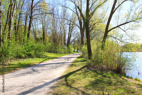 Peaceful Spring Walk Along Idyllic Country Road Near Danube Lake in Regensburg