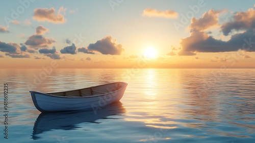 sunset, seascape, dinghy, boat, water, calm, ocean, sky, cloud, sunrise, gold, pink, orange, yellow, tranquil, peaceful, exterior, calm water, nature, landscape, seacoast, travel, tour tourism, holiday, relaxation, photo, beautiful, quiet