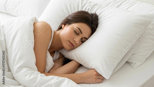 sleep, sleeping, woman, bed, bedchamber, rest, relaxation, relax, wellness, health, healthy, lifestyle, home, morning, comfort, comfortable, cosy, peaceful, calm, serene, tranquil, quiet, slumber, dream, dreaming, night, bedtime, clean, white, sheet, linen, pillow, duvet, blanket, brunette, hair, face, eye, closed, content, female, girl, young, adult, indoor, apartment, hotel