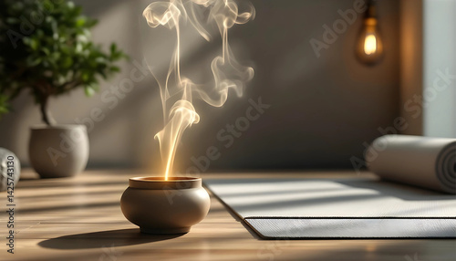 yoga, meditation, wellness, mindfulness, infuriated, smoke, aromatherapy, zen, calm, peaceful, calmness, relaxation, spiritual, bonsai, interior, home decor, wooden table, light, subtile, grey, beige, brown, incense burner, calmness, serenity, spa, natural light, interior design, still life, studio, lifestyle, practice, closeup, soft focus, warm light, organic, healthy living, feng shui, home