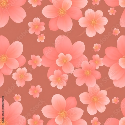 Peach Blossom Dream: A delicate and enchanting seamless pattern featuring soft pink cherry blossoms on a warm terracotta background. Perfect for spring designs and feminine aesthetics.