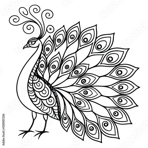 Peacock Coloring Page: Intricate Line Art Illustration of a Beautiful Bird with Detailed Feathers, Printable Animal Design for Relaxation & Creativity