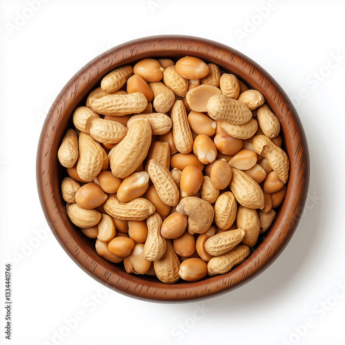 peanuts in a wooden bowl top view, Isolated on white Background.