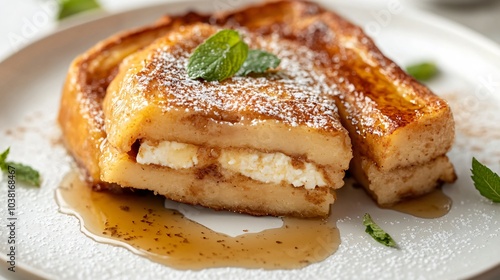 Pear and ricotta stuffed French toast, isolated on a white plate with maple syrup drizzle and mint leaves