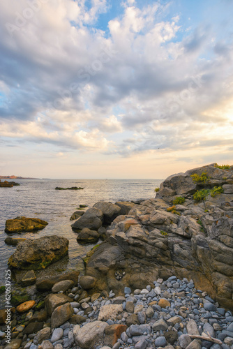pebble coast at sunrise. gorgeous view of seascape on a cloudy morning. relax and recreation at the sea