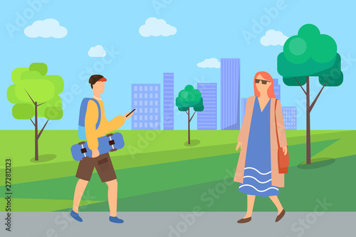 people, city, park, urban, vector, travel, grass, human, nature, bag, skateboard, pedestrian, sport, style, female, casual attire, green, holding, character, landscape, city landscape, road, lifestyle, signs, side, woman, wood, male, summer, skateboarder, town, full-length, building, walk, man, street, flat, sky, going, design, tree, person, spring, phone, day, board, modern, outside, illustration