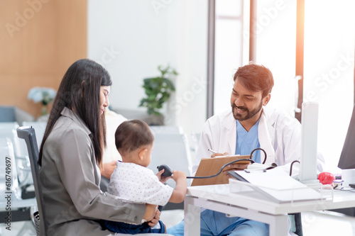 Pediatrician doctor consulting Asian mother about her little son health. Mother and son talking to therapist at consultation in hospital. Children healthcare concept.