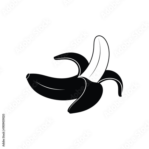 Peeled banana in minimalist illustration style with high contrast black and white coloring on clean white background for fruit icon