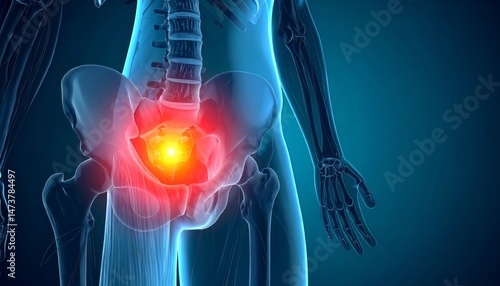 Pelvic pain illustration showcases skeletal system discomfort and lower back problems, highlighting inflammation and joint issues in a medical context