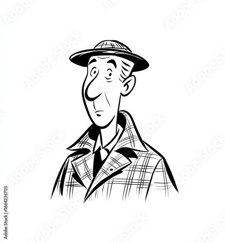 man, male, portrait, pen, ink, drawing, black-and-white, monochrome, surprised, shocked, amazed, astonished, startled, expression, face, coat, plaid, chequered, jacket, hat, fedora, retro, vintage, character, cartoon, comic, design element, gentleman, elderly, senior