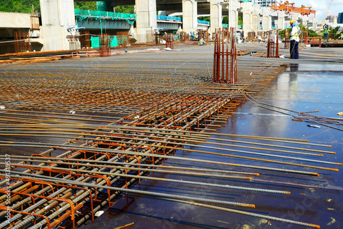 PENANG, MALAYSIA -MARCH 4, 2020: Floor slabs are under construction at a construction site. Workers were busy installing steel reinforcement on the timber formwork before concrete was poured on it.