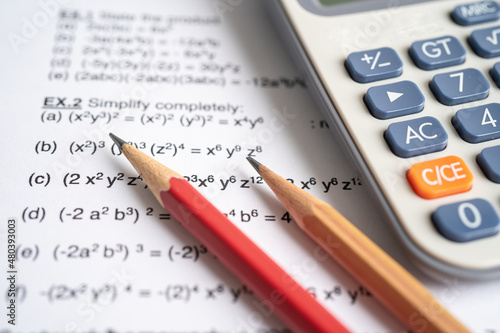 Pencil and calculator on mathematic formula exercise test paper in education school.