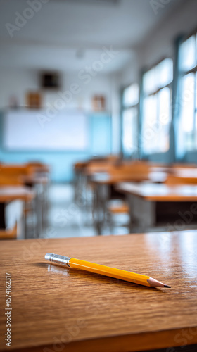 Pencil on Desk in Empty Classroom