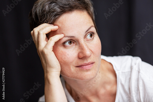 Pensive adult woman with short hair. Portrait on a black background. Close-up.