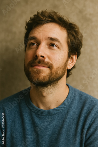 Pensive bearded man gazing upward with subtle smile, casual blue sweater against warm textured backdrop, hopeful contemplation, generative AI