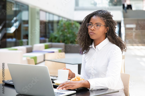 Pensive businesswoman thinking over ideas for project in cafe. Business woman having breakfast and using laptop. Wireless connection concept