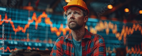 pensive, concern, construction, men at work, finance, chart, investment, work, reflective, economic, thoughtful, modern, man, hard hat, contemplation, business, worry, manual labor, planning, graph, occupation, projection, analysis, concentration, savings, strategy, blue-collar, insight, foresight