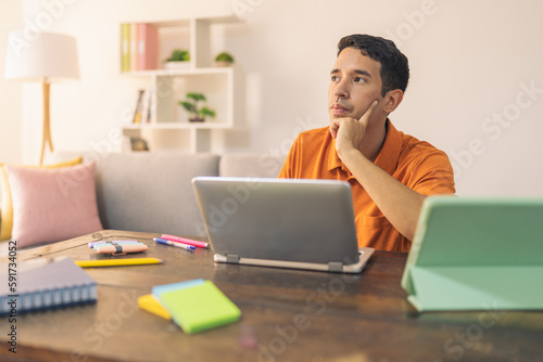 Pensive man using a laptop while working at home