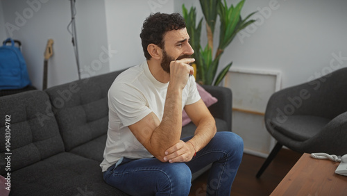man, beard, thinking, sitting, modern, living, room, interior, home, adult, contemplative, pensive, furniture, sofa, indoor, casual attire, jean, peaceful, relaxed, alone, calm, quiet, solitude, comfortable, stylish, plant, guitar, daytime, decoration, male, thoughtful, serene, house, domestic, white, t-shirt, blue, bag, dark, hair, wooden, table, frame, cushion, apartment, phone, cord, grey, sleeve