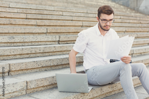 adult, business, businessman, career, computer, copy space, device, entrepreneur, executive, eyeglass, formal, contraption, photogenic, laptop, lifestyle, male, man, manager, occupation, outdoors, people, professional, sitting, staircase, stair, step, success, technology, work, holding, briefcase, thoughtful, clever, pensive, concentrated, document, contract, read, attentive, concerned, touch, typing, closeup, beard, caucasian, stylish