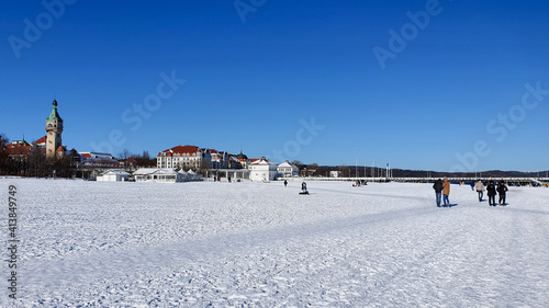 People are walking on a snow-covered beach in Sopot on a beautiful sunny day, Poland