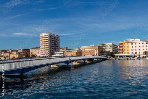 People cross the city bridge in Jazine bay in the town Zadar on a sunny day, Croatia