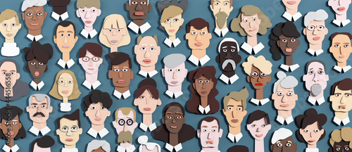 People faces made of paper. Lots of people different age and professional background. Paper cut design 3D rendering illustration