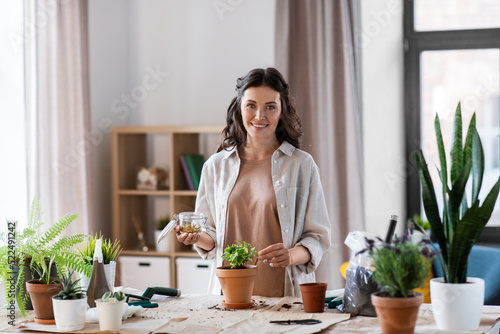 people, gardening and housework concept - happy woman with fertilizing spikes in jar planting pot flowers at home