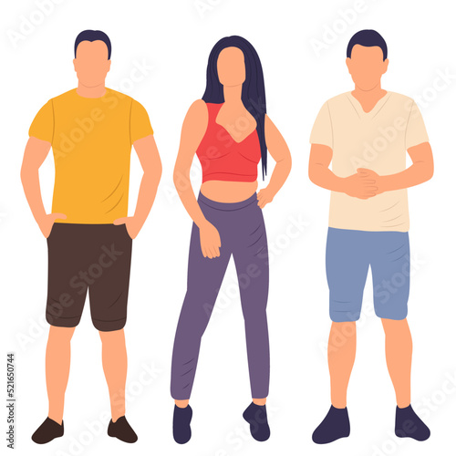 cartoon, vector, isolated, young, casual attire, fit, people, man, design, flat, guy, woman, girl, group, character, body, fashion, clothes, set, suit, clothing, fashionable, sporty, skirt, outfit, married, sweet, family, team