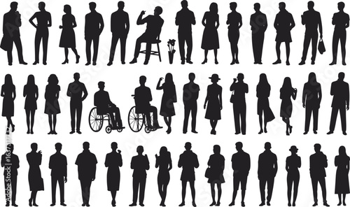 People silhouettes, diverse men and women standing, sitting, and in wheelchairs, casual and formal attire, inclusive concept, vector illustration